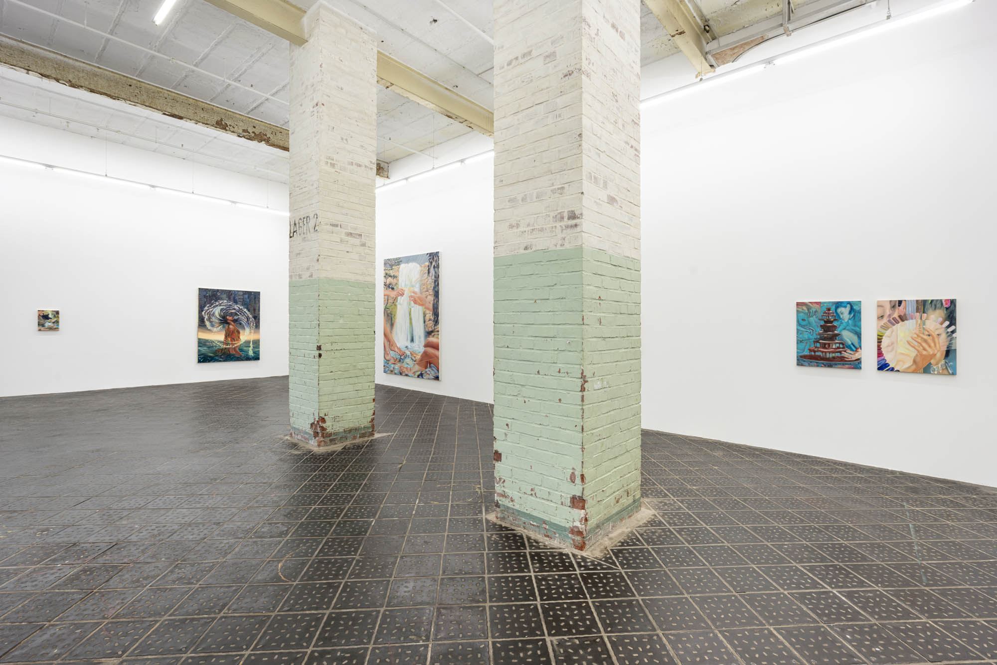 Galamb Thorday’s paintings show scenes of liquefaction. The face of the old baroness is already fading behind the fan, of which the choice of colour has become arbitrary. She bears it with composure, for she knows, just like Madame Pompadour, that «after us, the flood». The flood is triggered by a bearded mermaid who rises from the water, not to seduce but to destroy. His hair forms a flywheel that churns up the sea. Through the eye of the wave, we can already see its destination: A town on the coast where life still goes on as usual. Yet the changes do not escape the attentive. Even though «all that is solid melts into air, all that is holy is profaned» (Marx), the old ghosts creep back in. Blue fairies dwell at the chocolate fountain, and those who squeeze a lemon to season their oysters are watched by strange shadowy creatures. In another painting, two people raise their glasses once more to touch each other like Michelangelo’s Adam. But the lens is cracked. No one believes that two gods are meeting here, instead disenchanted people sit by the waterfall who just want to drink and enjoy the scenery once more before the sun sets and the waterfall comes down on them. No salvation comes from Asia either. In the shape of the blue lotus the Blue Flower of Romanticism, which today many assume to be in the Far East, eludes the grasp of hands that have become functionless. Their scissor fingers can at best cut. In the garden of the self-proclaimed master, there is indeed freshly brewed tea. The black pot hovers menacingly over the ceremony. The stone structure he has built for the purpose of cosmic calming seems extremely unstable. Even the swing of the pendulum does not prevent the demons from coming. They are already creeping around the western woman’s bikini body, on which the last supper is still being quickly served as a sushi buffet, while it is already on its way to another world. It is the downfall not only of the Occident, but of the whole world. The culmination of the Fin de Siècle into the finale of humanity, the Fin de Millénaire, of which Galamb Thorday is the chronicler. Born in the Imperial and Royal city of Keszthely, she presumably has a particularly fine sense for declining pompous cultures and the “Sunday of life” when one does not come to rest, but everything melts away.