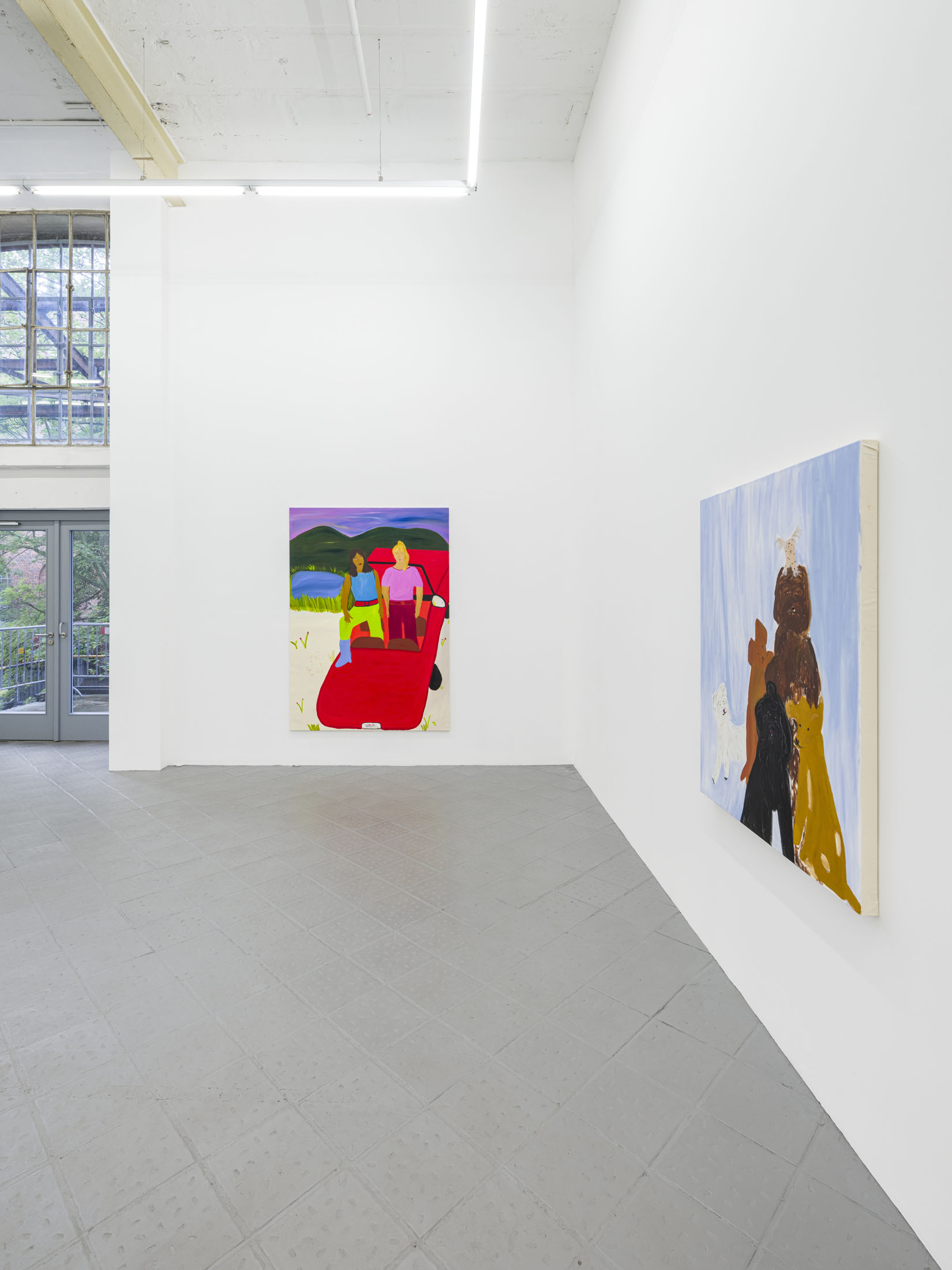 The new paintings by Josefine Schulz show scenes outdoors. Mostly in wide landscapes. There are no houses, but there are cars time and again. There are people in some of the paintings, and at least one dog in all of them. Overall, there are many more dogs than people in the exhibition. As ceramics, they even populate the floor: as if they had come out of the pictures to become even more real, even more present.