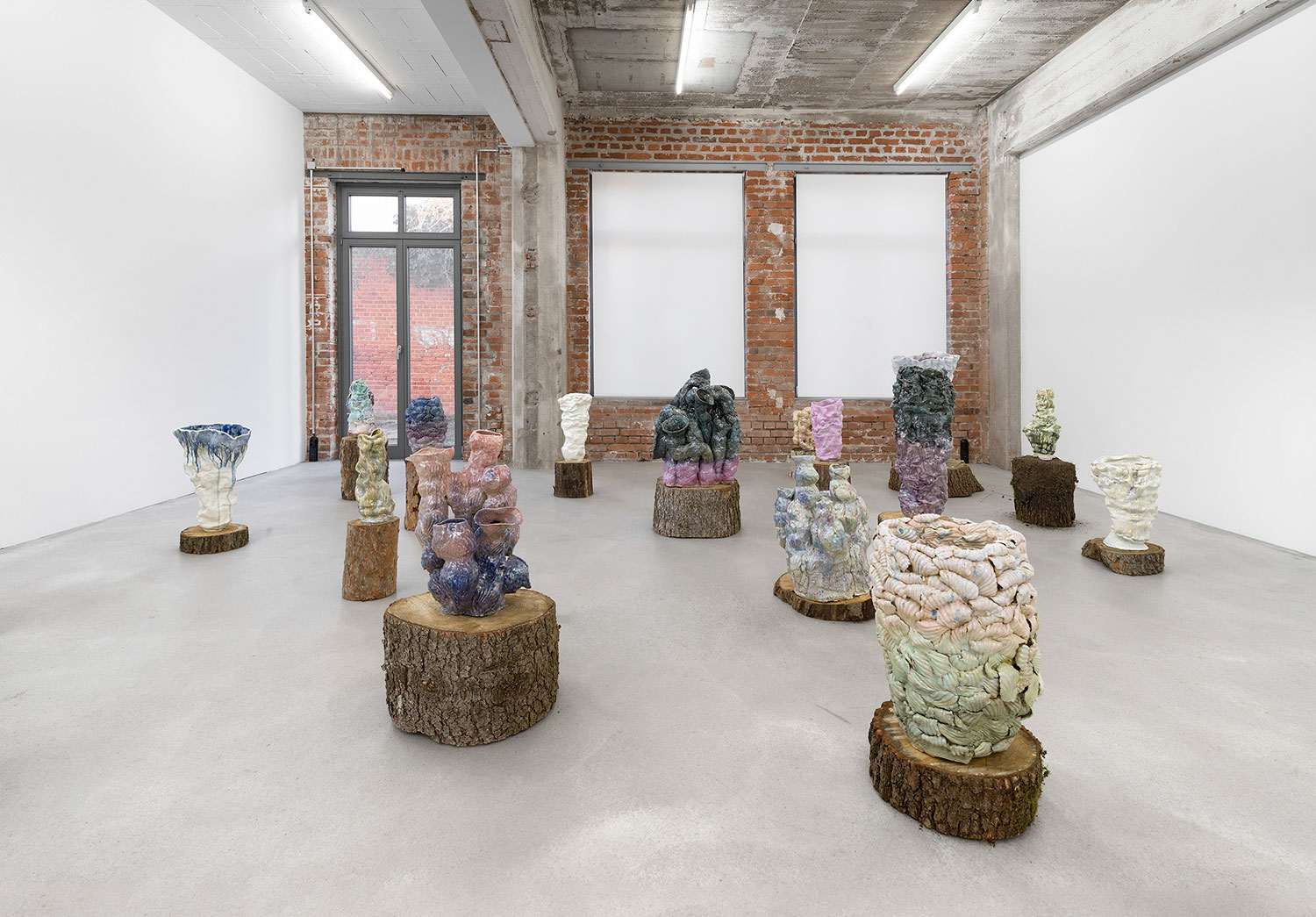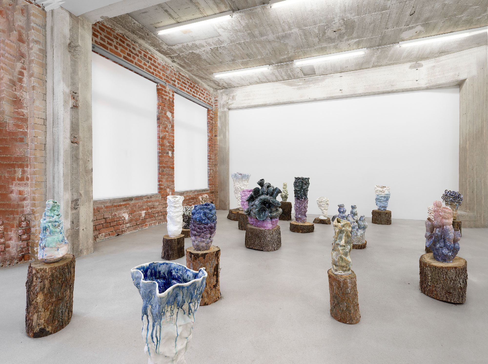 The exhibition WE SHALL SEA by the artist Sarah Pschorn invites us on a paradisiacal fantasy journey. At the beginning we are greeted by objects on a wall-mounted shelf and as we approach the gallery space we encounter a playful arrangement of about 25 ceramic sculptures created between 2021 and 2022. The show features a special selection of objects from the We Shall Sea, Shellfoam, Pirates Gospel and Cloudy series. In the quantitatively dense presentation, sculptures made of clay or porcelain are placed on discs cut out of tree stumps which are scattered around the room. These bases, made out of trees such as pine or birch, vary in size and are in different stages of drying, thus expanding the objects into an olfactory installative assemblage. Sarah Pschorn’s favourite form of expression, the vase, has visibly changed: The neck of the vase opens up, the body becomes more free and more voluminous, while the portraiture of the characterful individuals remains intact. The noticeable transformation of Pschorn’s objects from the original vessel shape and the shift towards more open organic and complex coral-like structures becomes visible for the first time in this exhibition. Pschorn’s typical colourfulness, inspired by design, fashion and pop culture, now meets muted and earthy tones resulting from her observations of nature. The multi-layered application of colour with glaze has a painterly liveliness. Lots of green, blue as well as brown tones form a basic palette are accentuated by pink, lilac, platinum and lustre. The glaze is shiny and shimmering, looking almost wet and seemingly running down the exterior of the vessels and sculptures. The colouring has both radiance and seriousness and is complemented by a mysterious and depth-giving glaze that the artist developed during her recent stay at the European Ceramics Work Centre (EKWC). The glaze always has a surprising effect on ceramics and alternates between blue, grey and black in its dark tonality. The resulting eventful and contrasting colour landscapes are visually appealing and awaken the desire to explore them more deeply. With her intricate plant-like elements and the motif of the shell, Sarah Pschorn creates a dreamy-elysian garden between the realms of underwater worlds, the earthly and the clouds.